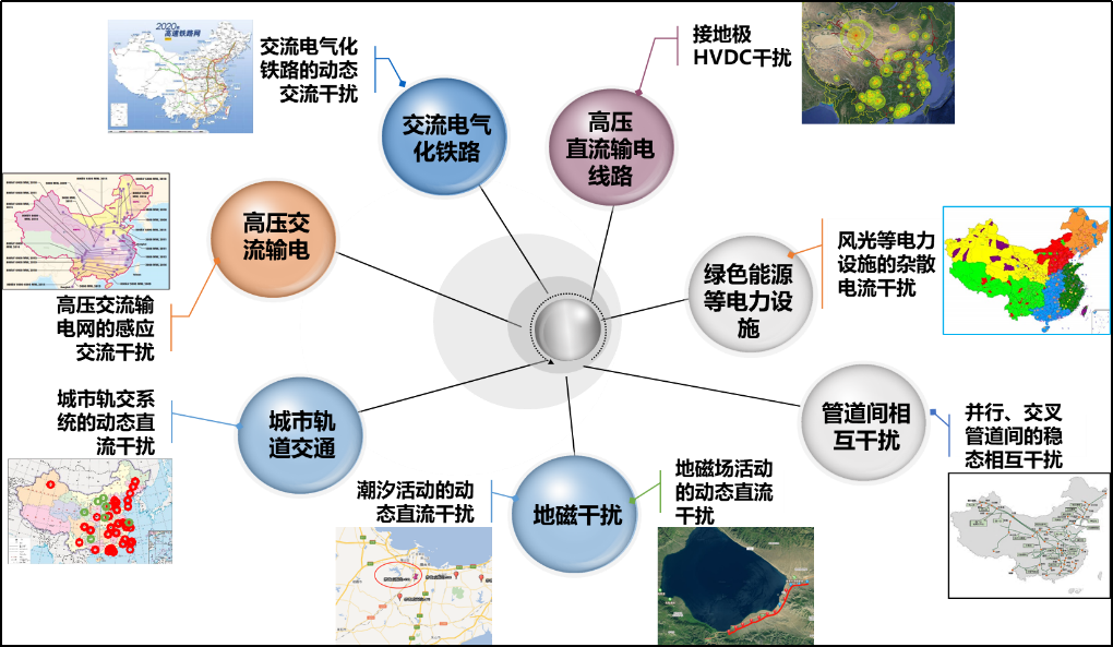 随着高压长距离输配电系统、电气化铁路网、城市直流轨道交通系统、绿色能源等基础设施不断规划与建设, 这些电力设施不可避免地与埋地油气管网出现长距离伴行、局部交叉或者相互靠近等情况,形成“公共走廊”,导致埋地管道受到复杂的电磁干扰。 公司开展不同类型直流和交流杂散电流干扰的现场调查、监检测、数据分析、数值模拟计算评估、防护设计、工程实施、调试及效果评价等整体服务。