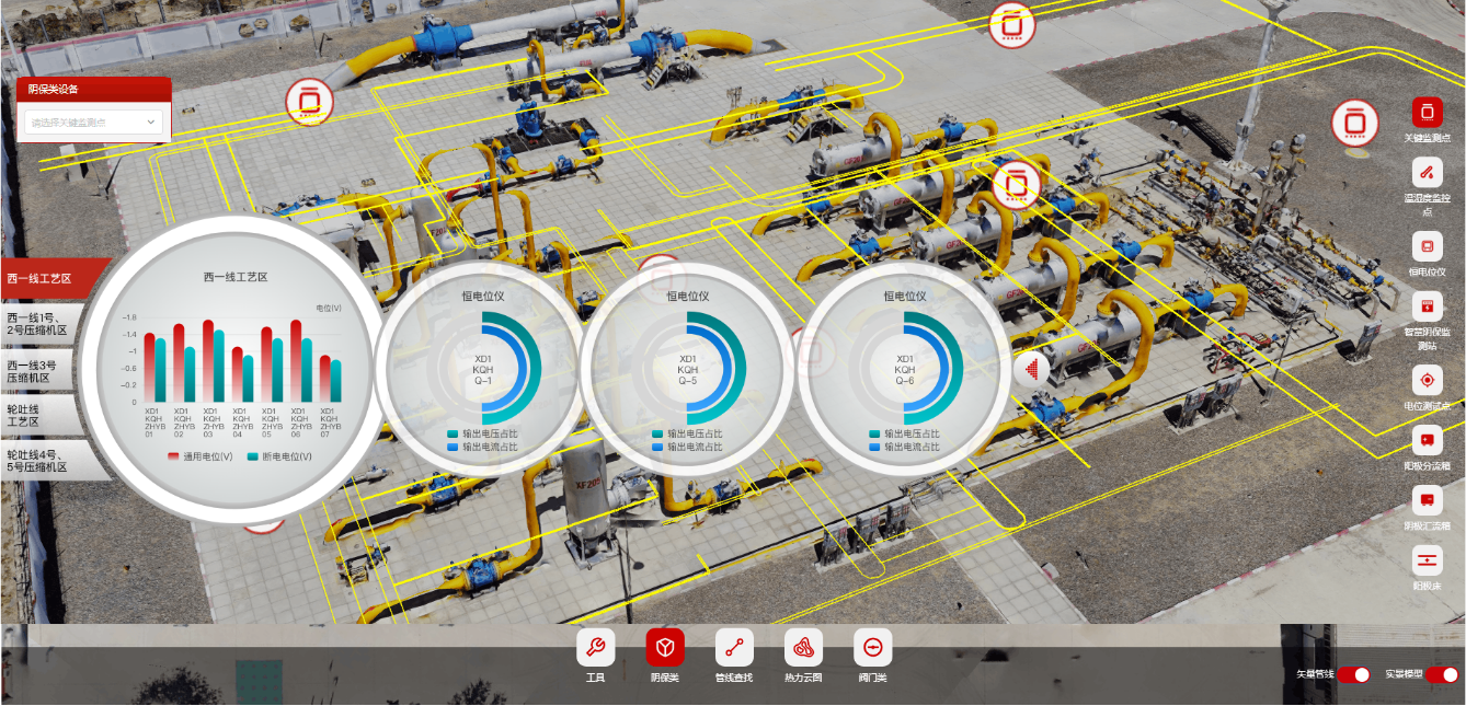 场站区域阴极保护智能化升级服务 公司提供场站区域阴极保护智能化升级服务,主要实现油气管道场站区域阴极保护电位及分路阳极地床输出电流分布全面监测、恒电位仪智能调控、埋地金属结构物电位仿真计算、电位热力云图展示与分析、场站设施保护效果可视化等功能。